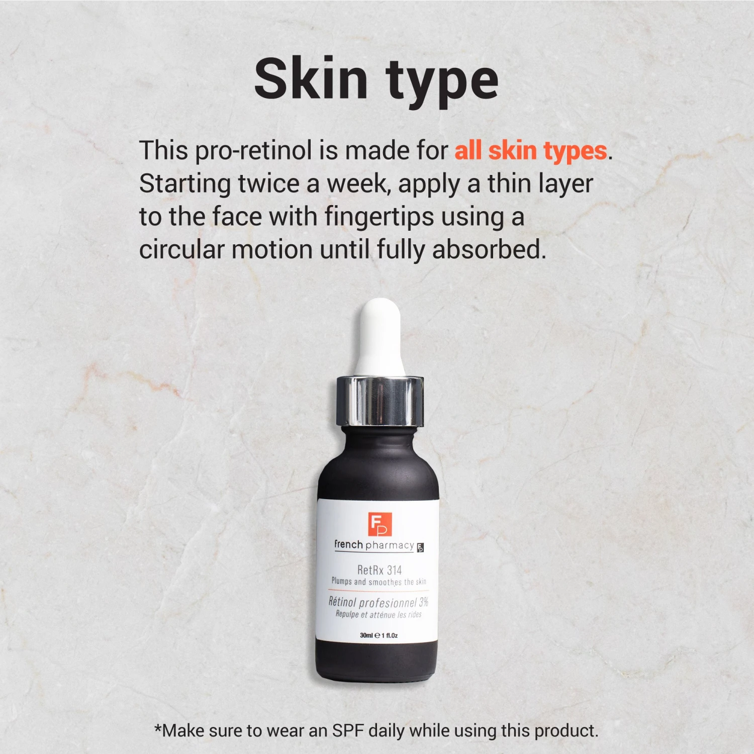 Our Pro-Retinol RetRx 314 (or “RET314”) is a complete anti-aging solution designed to reduce visible signs of aging, treat blemishes, and safeguard the skin from free radical damage. With the help of powerful antioxidants and a new-generation retinoid, your skin is left looking clear, firm, and supple.